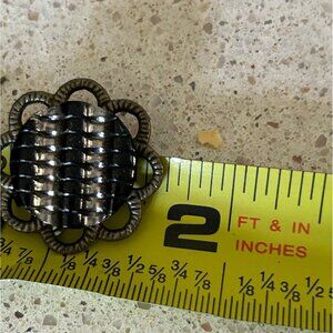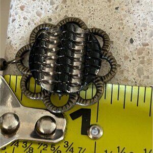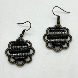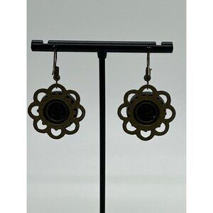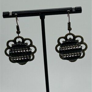These unique earrings feature vintage button-inspired silver-tone centers within gunmetal gray floral frames, offering a timeless and artistic design for casual or dressy wear.