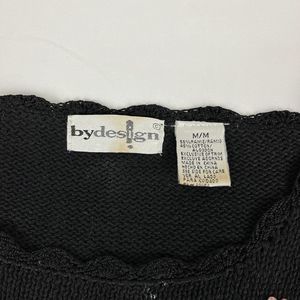 Women's By Design vintage 90's black sweater with pastel crewel embroidered flowers. Size Medium. 55% ramie, 45% cotton. Shoulder pads - easy to remove if needed. Crochet lace trim. Excellent condition! Measurements: 22" armpit to armpit. 26.5" length.