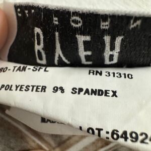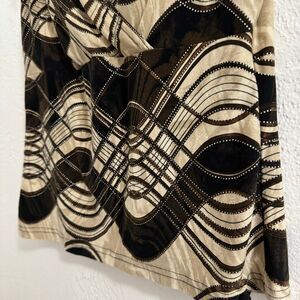 Vintage made in USA stretchy v-neck tank top with ruched tie straps and a retro wavy pattern in brown tones accentuated by silver glitter.