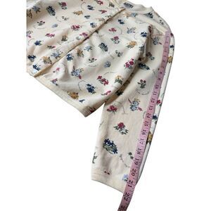 This is a charming vintage cardigan with a delicate floral print on a soft creamy yellow colored background. The lightweight fabric features an intricate design of small, scattered flowers in shades of red, blue, and yellow, along with elegant cursive text in a different language that adds a unique, poetic touch. The round neckline and button-down front give it a classic, timeless look, while the relaxed fit and long sleeves make it comfortable for layering. This cardigan is perfect for adding a touch of nostalgia and romance to any outfit.