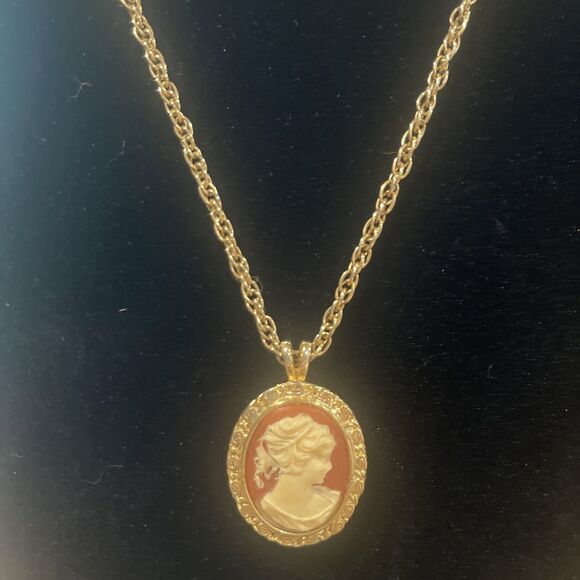 Vintage CAMEO Avon Lady Long NECKLACE 24 Inch Chain Goldtone Rust Spots In Chain