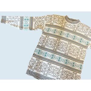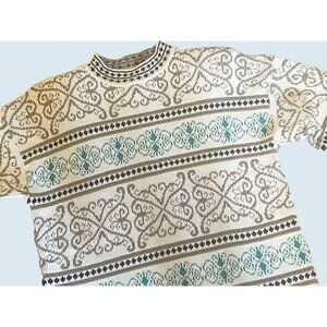 Great vintage fair isle sweater. Circa 1990s. Oversized. Pull on style. Off white / cream color with multi color print in muted tones. Made by Cape Cod Sportswear. Vintage size Small (see measurement diagram in photos). 100% acrylic. Shoulder pads. Some gold sparkle thread mixed into print. Very nice vintage condition!