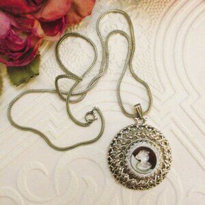 Desirable, Vintage, Double-Sided, Silver, Intaglio Glass Cameo, Watch Pendant Necklace by WHITING & DAVIS.** With Hidden CARAVELLE By BULOVA** Mechanical Watch.
