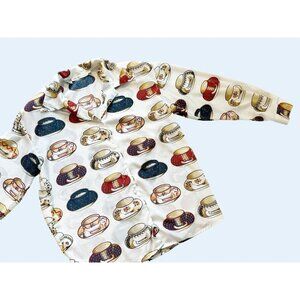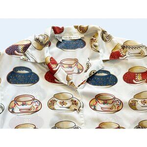 Vintage CARLIE'S COURT 90s Tea Cup Print Silky Full Button Blouse Sz M