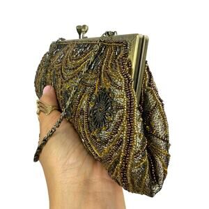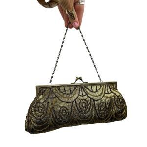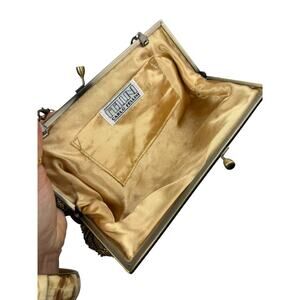 Vintage CARLO FELLINI metallic gold lame fabric beaded mini purse. Kisslock closure. Some light stains on the lining inside (see photos). Straps tucks away. 10.5” x 4.5”.