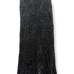 Vintage 1990's CARMEN MARC VALVO runway black lace glass beaded evening gown. Beautiful black lace form fitting full length evening black tie dress fully covered in handmade glass black beading. I had a hard time capturing the beautiful glitz and sparkle of the black beads. The back is a deep low scoop. Full back zipper. Back slit up the middle. Fully lined. 80% Rayon 20% Nylon, fabric has light stretch to it as Rayon does. Marked size 4. Excellent like new condition, all beads seem to be fully intact.