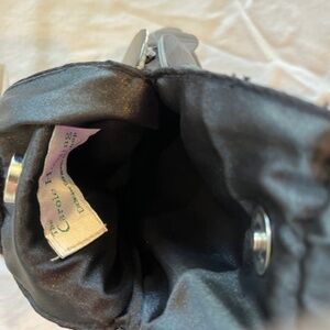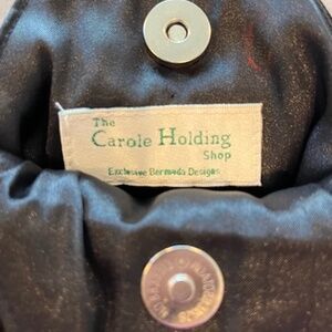 This vintage "The Carole Holding Shop" Mini Bracelet Handbag features natural shell beads and bracelet handle. The bag is in black satin with a magnet metal clasp.