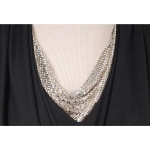 Stunning chic vintage 80s Carteret New York black sheath dress with silver-tone metal chainmail mesh attached necklace detail. Draped faux wrap criss-cross front detail. Long sleeves. Shoulder pads that can be easily removed. Pull over style. Amazing condition! Cocktail, party, event LBD.