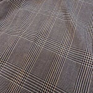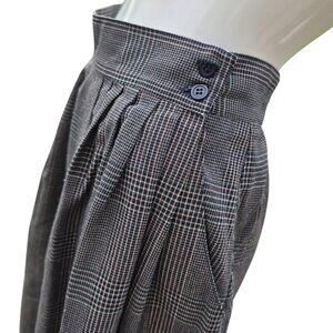 Vintage black and cream plaid A-Line skirt by CASABLANCA. Elastic at back waistband. Left Front waist band has two button closure. The front is pleated with two pockets. Excellent vintage condition. No holes, rips or stains.