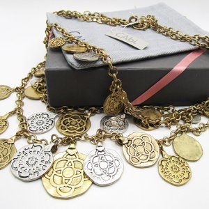 Vintage CAbi 3-strand layered coin necklace in gold and silver. NWT. Box has some wear. It measures 24" to 27".
