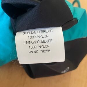 Stylish two-tone windbreaker jacket in navy and teal. Perfect for outdoor adventures.