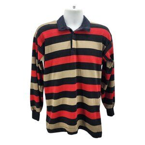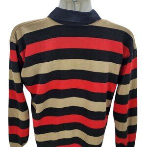 Long sleeve collared thick rugby jersey shirt with a black, red & tan horizontal striped pattern. Two buttons at the neckline. Material has a stretch. Cotton & Polyester blend. Made in New Zealand.