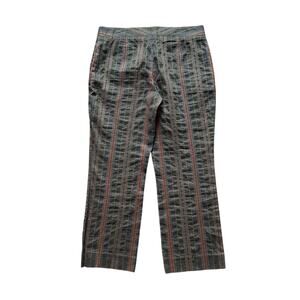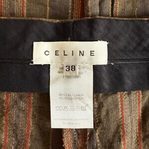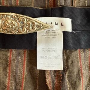 Authentic vintage Celine linen blend pants from the early 2000s. They are in excellent pre-owned condition. Chocolate brown with gold and rust stripes. Mid rise with zipper closure, side pockets and ankle length.