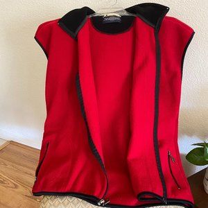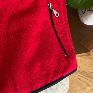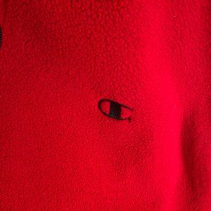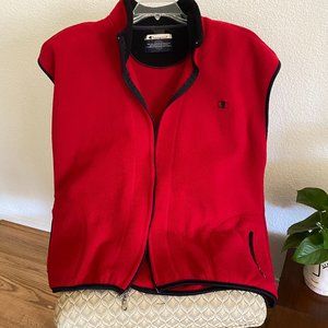This vintage preowned classic CHAMPION fleece vest is lightweight, NOT bulky, and very comfortable. The color is bright red with navy trim. It has two exterior pockets but none on the inside so it to drops smoothly and is not bulky. I have included close pictures of the fabric. It is lovely, has beautiful styling, and is very clean without any discolorations or bare spots. It's a classic, with a vintage label and logo. Measures 28 inches long and 26 inches across.