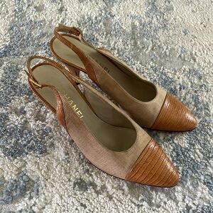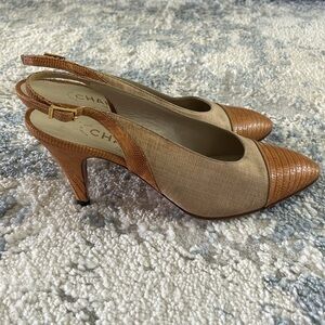 Authentic Vintage CHANEL Beige Canvas and Leather Slingback Pumps Size 8