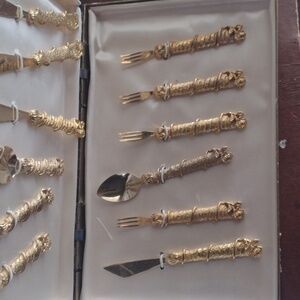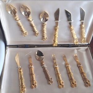 Vintage CHARCUTERIE & APPETIZER Dainty Gold Tone Forks Knives- In Original Boxes