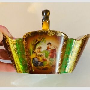Vintage CICO Porcelain Basket Bavaria Germany Courting Couple Green Gold Small