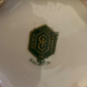 Vintage CICO Porcelain Basket Bavaria Germany. The main colors are Green Gold and Brown. This is a small basket which measures 5” long, 3 3/4” wide, and 3” tall up to the handle.