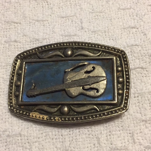 Vintage belt buckle silver tone with blue around guitar 🎸 preowned Check photo has some wear on front from smoke free home