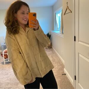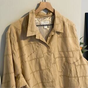I adore this super cute vintage CJ Banks tan/neutral faux suede super soft satin lined textured embroidered stitched collared button front long sleeve top/jacket