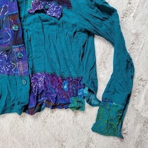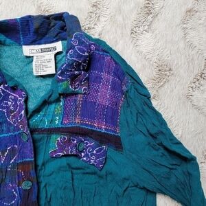 Vintage CM Shapes Turquoise Blue Green Patchwork Button Up Blouse Size 6