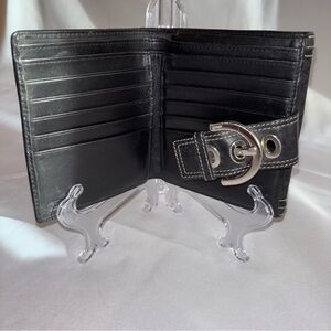 Stylish black Coach wallet featuring a silver buckle. Perfect for everyday use.