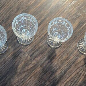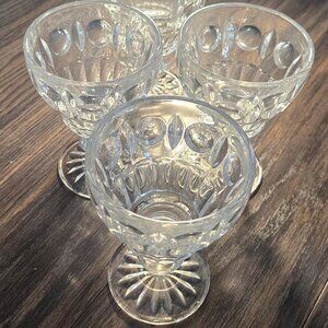 Beautiful set of four COLONY, "Classique" clear thumbprint water/wine goblets with pedestal stem and "starburst" pattern on bottom. Very nice-quality, thick glass...well-known in vintage glass. Each glass is in pristine condition. Could also be used as a dessert cup. DIMENSIONS: 5.5" tall x 3 3/4" wide x 3.5" depth.