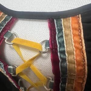 • Multicolor velvet trim with metal d-rings and yellow velvet ribbon lace-up front