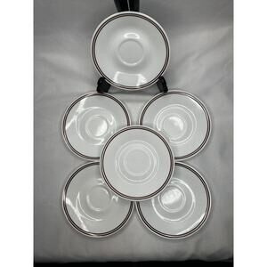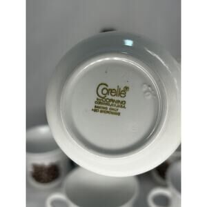 This set of 6 vintage Corelle Batik cups and saucers features a brown floral pattern with a glossy finish. Made of glass and dishwasher safe, these round cups and saucers are perfect for all occasions and are signed as a printed backstamp. Manufactured in the United States in 1979, these cups and saucers are a charming addition to any table setting with their floral theme and brown and white color scheme.