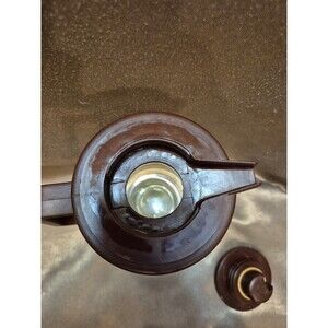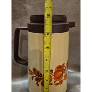 This is a vintage CorningWare coffee pot in a retro style, featuring a Garden orange and brown floral design. The coffee pot is made of plastic and metal, with a height of 10 inches. It is a 1-quart thermos carafe, perfect for serving tea or coffee.