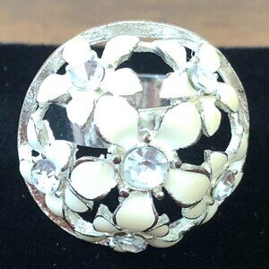 Vintage White Enamel Flowers with Crystal Rhinestones Ring Costume Statement Cocktail Size 10