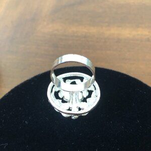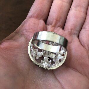 Beautiful vintage ring dome shaped, with 6 white enamel flowers and rhinestones crystals in the center of each flower. Mounted on silver tone metal. Metal has been untested and it could be stainless steel or another alloy. Statement, cocktail ring.