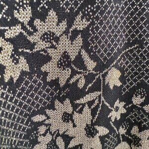 What a fun little piece this is! Perfect for around the holidays with that shimmering gold woven throughout. In excellent vintage condition except missing the size and care tags. Based on how this fits me and by measurements taken flat, I'm guessing this is probably a size large. And for care, I'd just machine wash cool inside out and lay flat to dry.