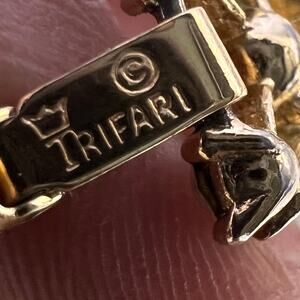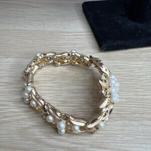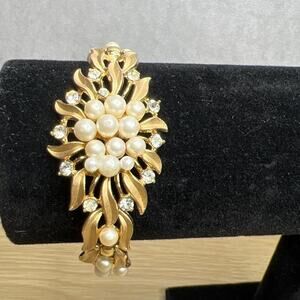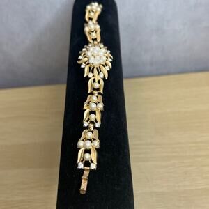 Vintage CROWN TRIFARI Pearl Rhinestone Domed Flower BRACELET Brushed Gold Tone