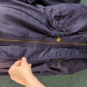 The fabric is a beautiful dark blue, with a little bit of texture... The collar is gold. The zipper pull and buttons are super cute!!