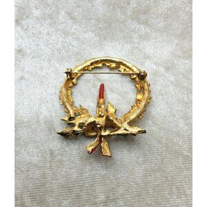 This vintage brooch features a beautifully detailed gold wreath adorned with red and green accents. A charming candle design completes the festive look, making it perfect for holiday wear or collection.