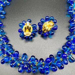 Vintage CZECH element blue teardrop glass beads clips on earrings and necklace
