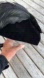 This glamorous 1930 - 40’s hat is sculpted black velvet in a Juliet Style toque silhouette draping dramatic iridescent black green purple hue feathers few.