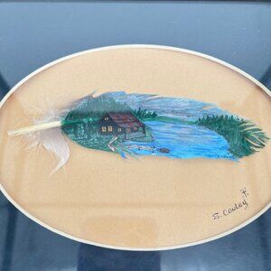 Vintage Cabin By the River Artist signed Oil Painted Feather Framed