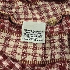 This is a vintage women's button-up top from Cabin Creek. The top features a red and white plaid pattern with embroidery accents. It has a collared neckline and long classic/fitted sleeves. The top is made of 100% cotton and is machine washable. It is a plus size 2XL and has a regular fit. The top is perfect for travel and casual occasions during the summer, fall, and spring seasons. The themes include Western, Flower, and 90s. The top has easy care features and was made in India.