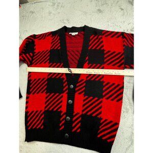 This medium-sized cardigan from Cabin Creek features a bold red and black plaid pattern. Crafted entirely from acrylic, it offers warmth and comfort.