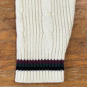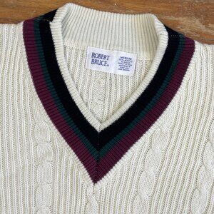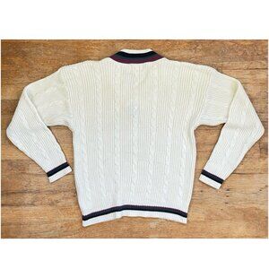 Knit acrylic, pull on v-neck sweater with cable knit pattern and stripes. Ribbed cuffs, neckline, and hemline.
