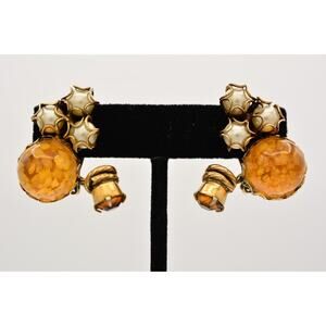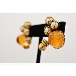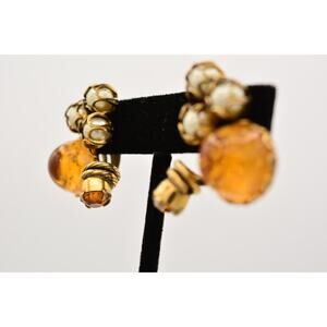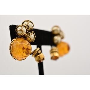 Vintage Cabochon Clip On Earrings Antiqued Gold Orange Pearl Chunky 1940s BinAG