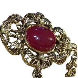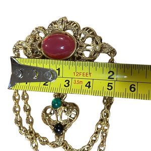 This vintage brooch exudes a classic Victorian style with its seed bead and faux pearl embellishments. The gold-tone brooch features a dangling cabochon that adds a touch of elegance to any outfit. The multicolor stones make it a versatile accessory that can blend well with various styles and colors.