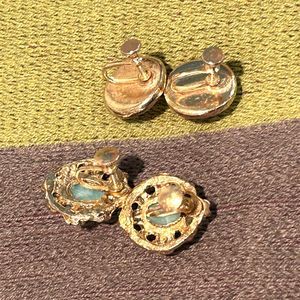 Set of two vintage screw back earrings in excellent condition. Please see the pictures for all the details. Blue-green harlequin glass oval cabochon and faux seed pearls set in gold tone backing. 1" x 3/4" Round gold tone earrings have peach resin center surrounded by rhinestones. 3/4" diameter.