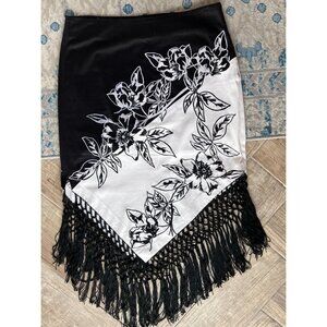 Vintage Caché ASYMMETRICAL Skirt Size 8 Black & White Fringe Floral Embroidery