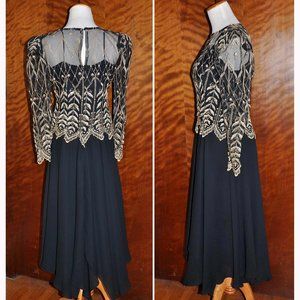 This is a stunning black chiffon vintage dress with gorgeous gold embroidery on the top section and sleeves. Below the top bodice is a black bodice with spaghetti straps and a full black chiffon skirt with an amazing handkerchief hemline. The bottom of the dress is so delicate and feminine looking and the entire dress is striking! This can be worn to a wedding, out to dinner or a movie, a formal affair or even to go dancing and watch the layers of the skirt twirl on the dance floor. The length is 3/4 length.