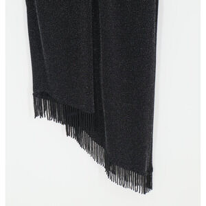 Striking Cache black cocktail dress featuring metallic silver threading, bodycon silhouette, ruched front, deep V neckline, and an asymmetrical hem with long beaded fringe. Fully lined with a back zipper closure.