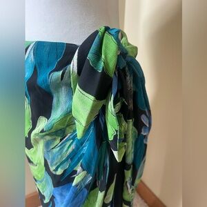 This is a gorgeous, VERY WELL MADE Skirt. Hawaiian vibes! The skirt itself black zips to hug you and the tropical blue and green leaves leaf wrap us attached but ties at the hip.