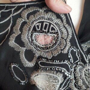 Vintage Cache Blouse Womens XS Silk Black Silver Embroidery Peplum 3/4 Sleeve